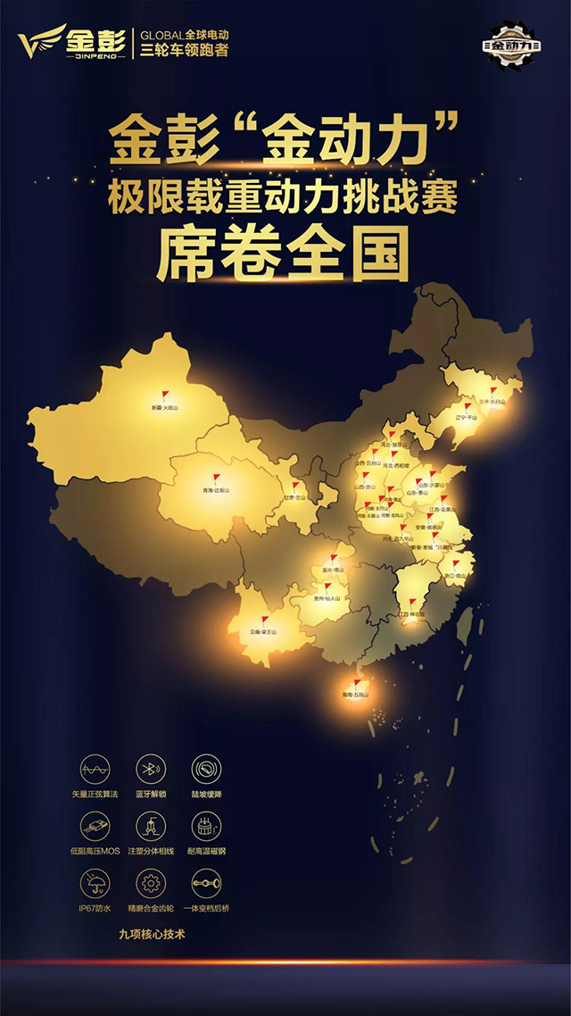 此次金彭“金動力”極限載重動力挑戰賽囊括大部分耳熟能詳的歷史名山:山東泰山、河南嵩山、新疆火焰山、山西五臺山、河南太行山、吉林長白山、海南五指山、河南西九華山、安徽瑯琊山、河北西柏坡、江蘇花果山等,用行動證明金動力的卓越性能。