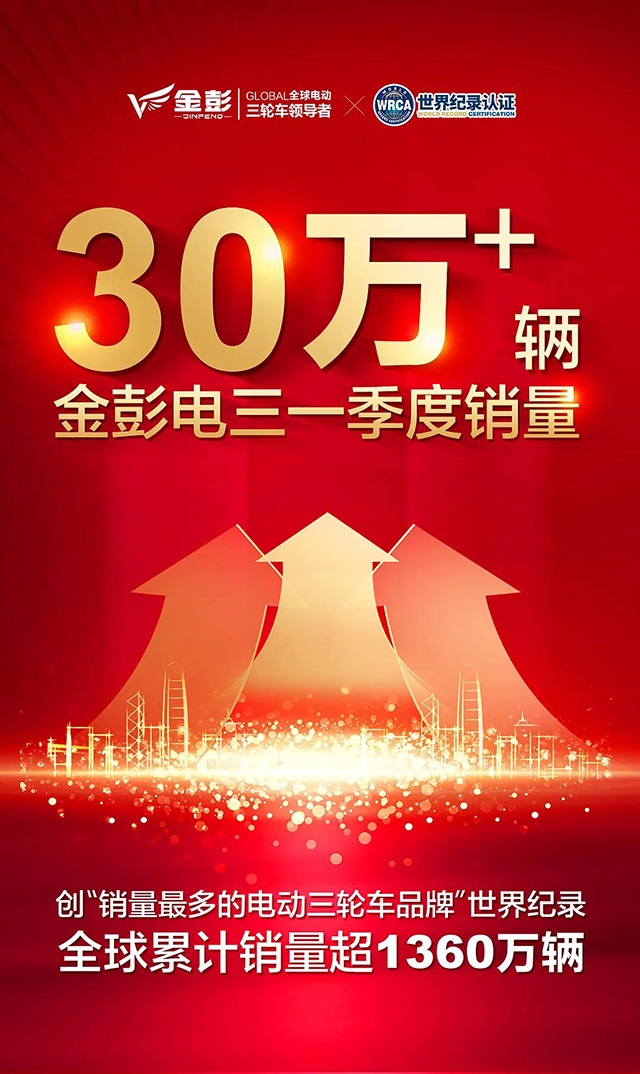 不負眾望,WRCA “全球銷量最多的電動三輪車品牌” 世界紀錄獲得者——金彭在4月伊始再次交出一份漂亮答卷:一季度電三銷量超30萬輛,再創歷史新高。