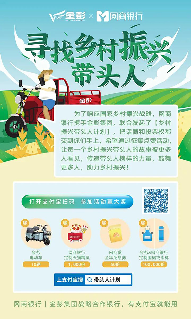 多年來(lái),金彭用科技創(chuàng)造美好出行,用便捷服務(wù)廣大群眾,成為鄉(xiāng)村振興中不可或缺的強(qiáng)力助手。此次金彭與網(wǎng)商銀行的戰(zhàn)略合作,聚焦鄉(xiāng)村故事,惠及廣大農(nóng)民群眾,合力挖掘鄉(xiāng)村振興中的優(yōu)秀帶頭人,更能激發(fā)廣大農(nóng)民群眾的積極性、主動(dòng)性、創(chuàng)造性,助力鄉(xiāng)村振興駛上快車(chē)道。
