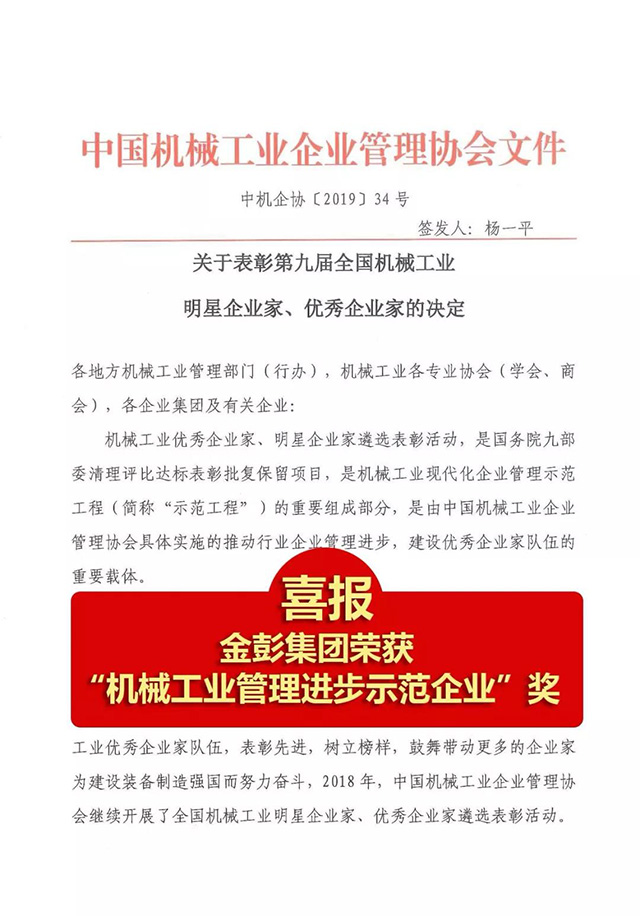 2019年3月,金彭集團通過江蘇省機械工業協會審核,并推薦至中國機械工業企業管理協會初審。,2019年11月,中國機械工業企業管理協會又組織多名專家專程前往金彭集團進行現場評審考察。憑借強大的產品力和創新力,最終,金彭集團從全國優秀的機械工業企業中脫穎而出,榮獲 “機械工業管理進步示范企業”獎,這也是金彭卓越的品牌實力和影響力的體現